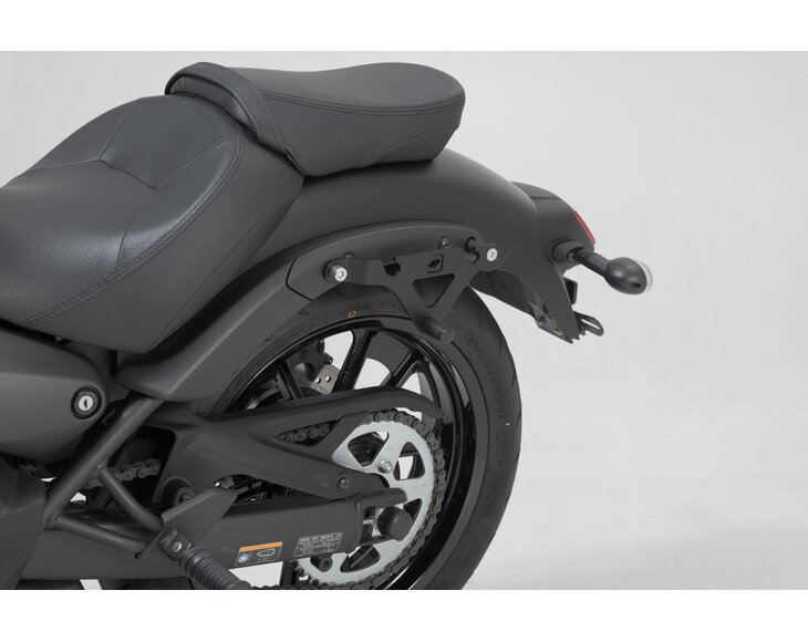 The bike-specific bag carrier can be easily and quickly mounted on to original attachment points on the fender strut. The quick lock system allows LH Legend Gear side bags to be attached and removed in just a few easy hand movements, without the driver foregoing reliable bag fastening.