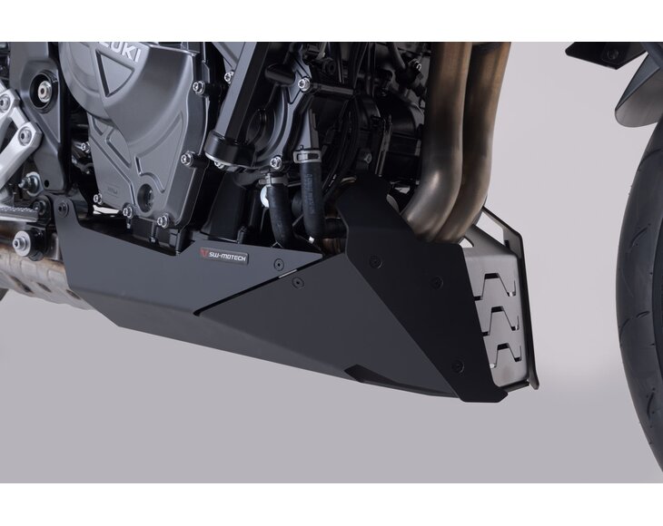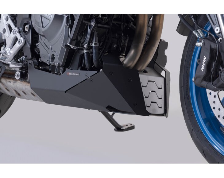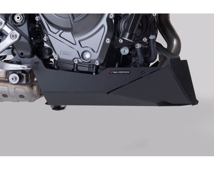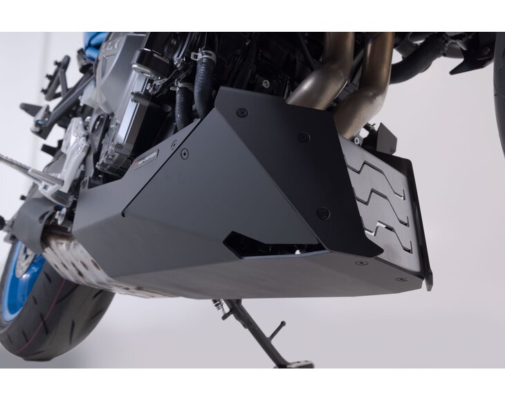 The SW-MOTECH front spoiler, which is tailored to the design of the bike, offers reliable protection against stone chips and unintentional contact with the ground. The powder coating on the surface is extremely durable and permanently protects against corrosion. Extremely sturdy underbody protection can be easily attached to original attachment points using the custom steel attachments provided, all without drilling or welding.