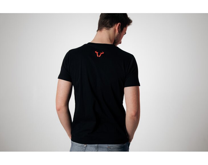 The black t-shirt with round neckline has the SW-MOTECH logo and the red bull's head on the chest. The red bull logo on the top of the back provides an extra eye-catching element. This casual top is made from 100% cotton, is easy to care for and offers a high level of comfort.