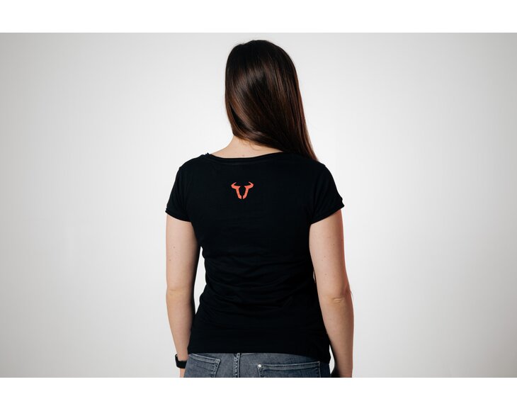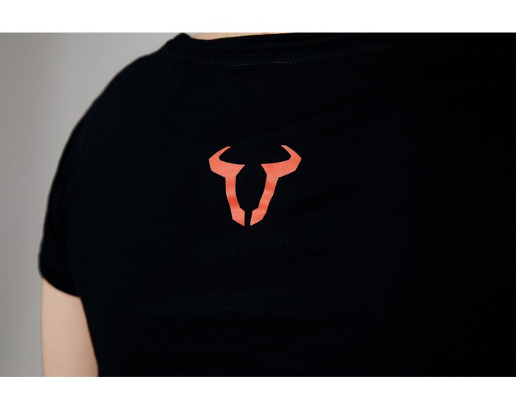 The black t-shirt with round neckline has the SW-MOTECH logo and the red bull's head on the chest. The red bull logo on the top of the back provides an extra eye-catching element. This casual top is made from 100% cotton, is easy to care for and offers a high level of comfort.