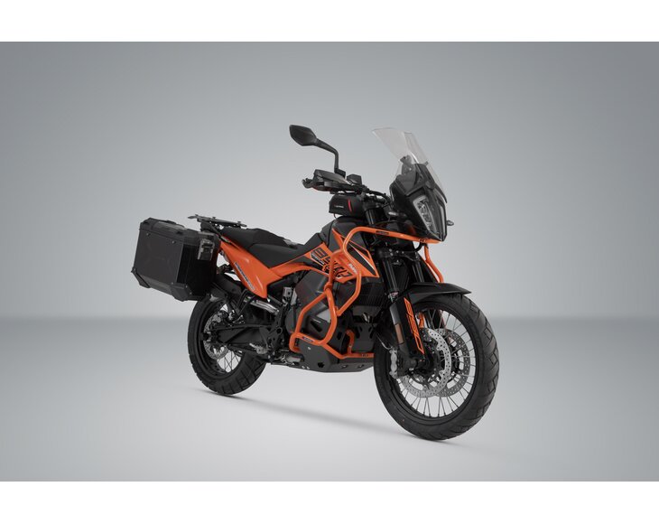 The aluminum case system is built by SW-MOTECH for the KTM 790 Adventure and KTM 890 Adventure. It comes with extremely durable bike-specific PRO side carriers.