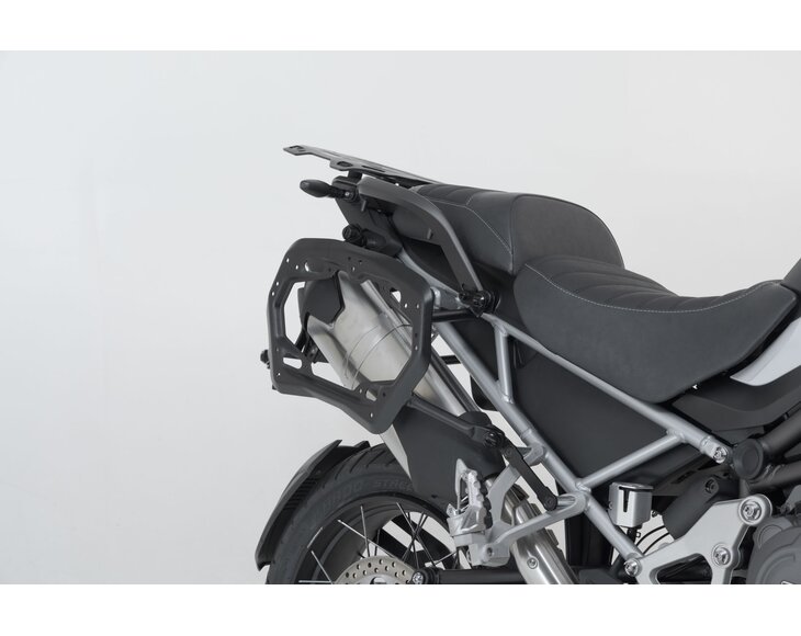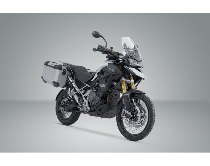 SW-MOTECH makes this silver aluminum case system suitable for the Triumph Tiger 1200, featuring extremely durable, bike-specific PRO side carriers.