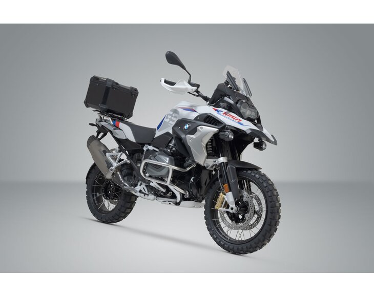 The TRAX ADV top case system consists of a sturdy silver top case and matching ADVENTURE-RACK for the BMW R 1250 GS Adventure with Rallye bench seat.