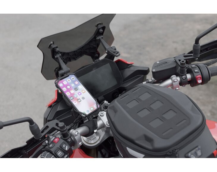 Our universal kit offers a variety of different mounting options on the motorcycle: the 1-inch ball provided can be mounted on an M6 or M8 thread, mirror thread holder or a mounting clamp. The mounting clamp is designed for handlebars with a diameter of 22.28 mm or 1 in. A pivoted socket arm makes positioning in the cockpit easy - so the display always remains in plain sight, without obstructing instrument view. The T-Lock holder with smartphone mount is included in delivery and allows you to quickly attach smartphones to the Universal Navi kit. The T-Lock holder can be secured to the socket arm with a quarter turn clockwise. The silicone straps on the smartphone mount are used to attach devices of different sizes.