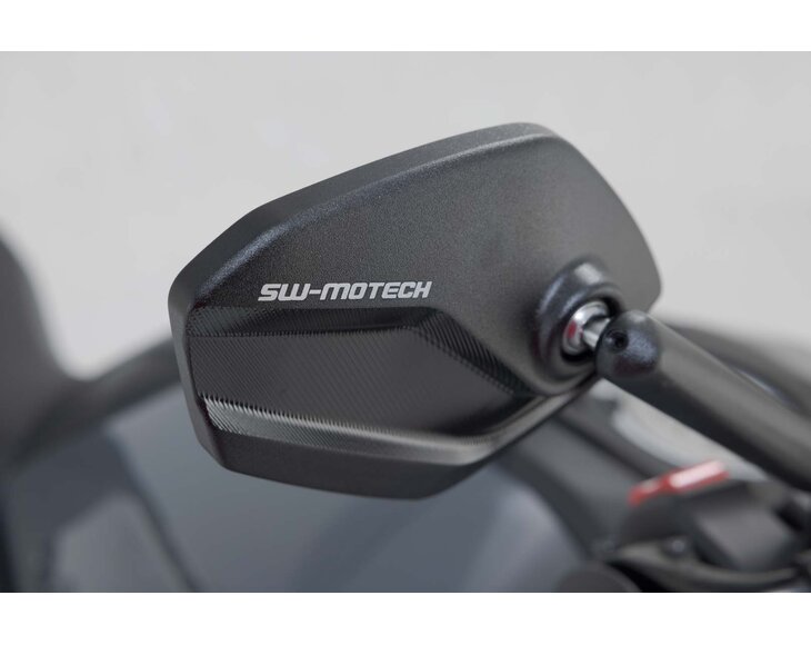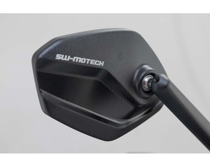 SW-MOTECH vyrábí nastavitelná zrcátka v moderním a plochém designu z vysoce kvalitního kovaného a černě eloxovaného hliníku. Ramena zrcátek se skládají z plynule nastavitelných prvků a každé z nich lze prodloužit o 30 milimetrů. To umožňuje přizpůsobit výšku a délku zrcátek požadavkům příslušného pilota.
